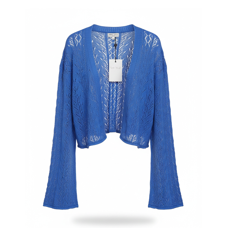Aquesta jaqueta curta (cropped) de punt no només és tendència, sinó que es convertirà en el teu complement ideal per a qualsevol època de l’any. El seu vibrant blau elèctric (cobalt) afegirà un toc de color sorprenent a qualsevol outfit neutre.